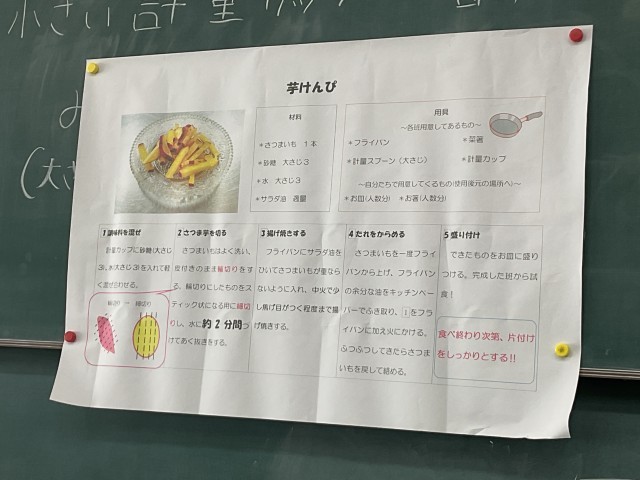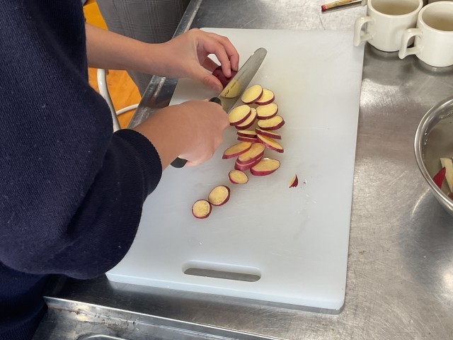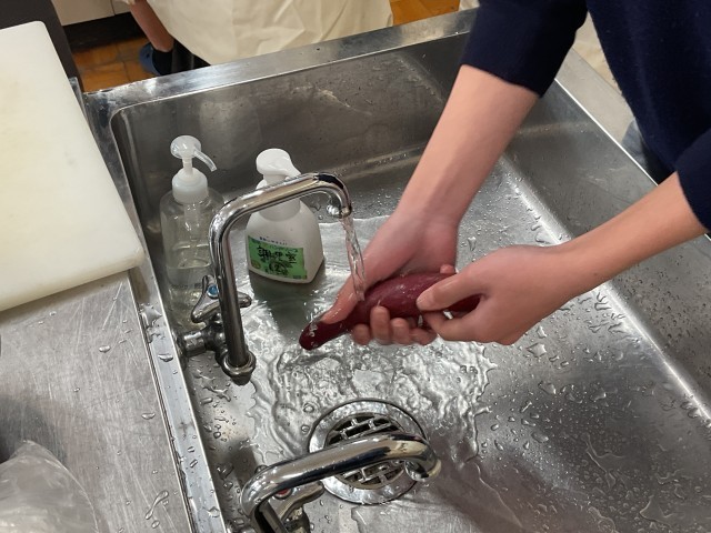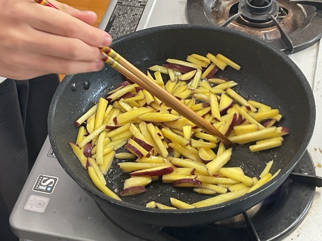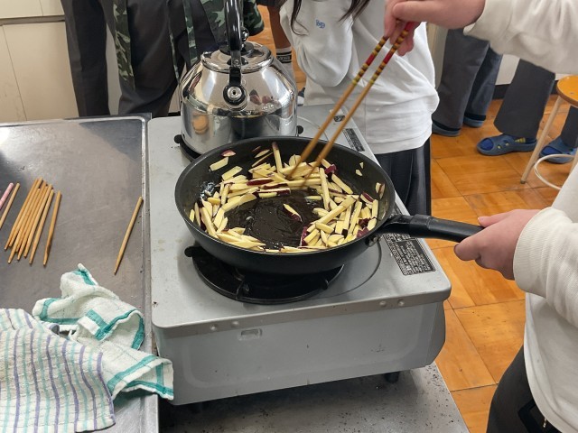 調理実習で「芋けんぴ」を作っていました。各グループで協力して、美味しそうな芋けんぴができました。