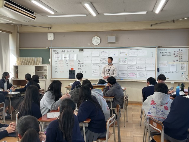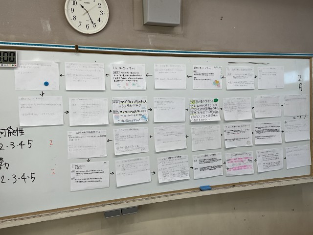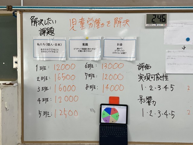 自分たちで考えた世界中に課題について、班ごとにそれぞれ引いたカードの内容に沿って、解決方法を考えていました。知恵やアイディアを出し合い、クラスに向けて発表し、他の班が評価をしていました。とても楽しそうに取り組んでいました。