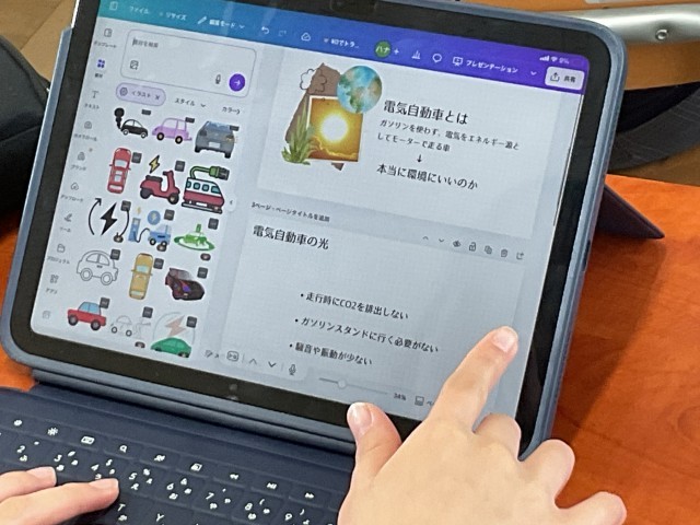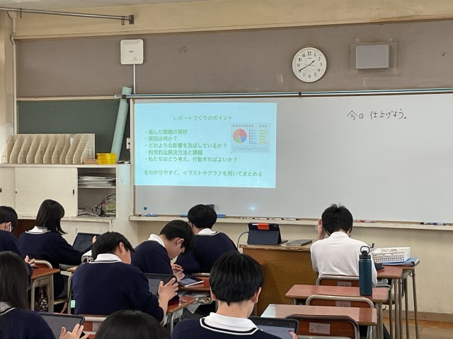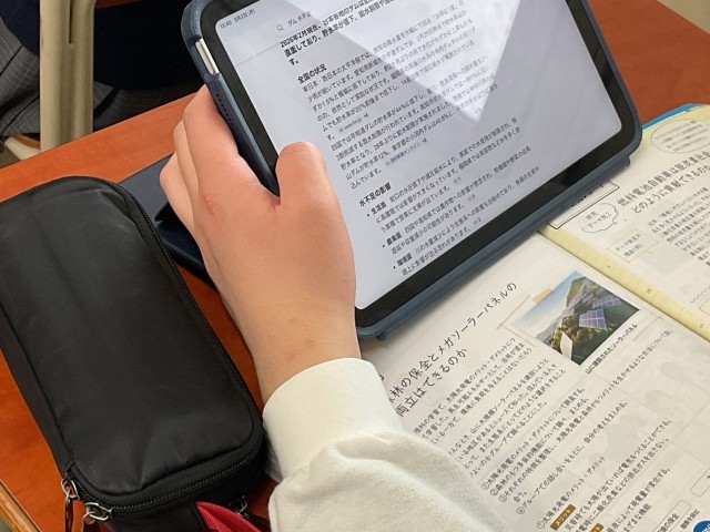 タブレットや教科書等を使用し、レポートを作成しています。