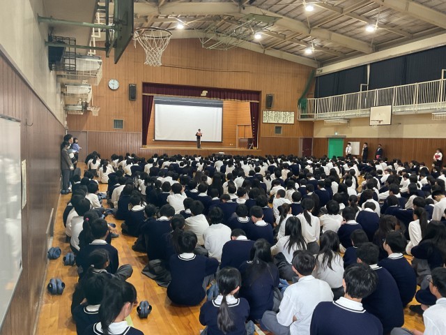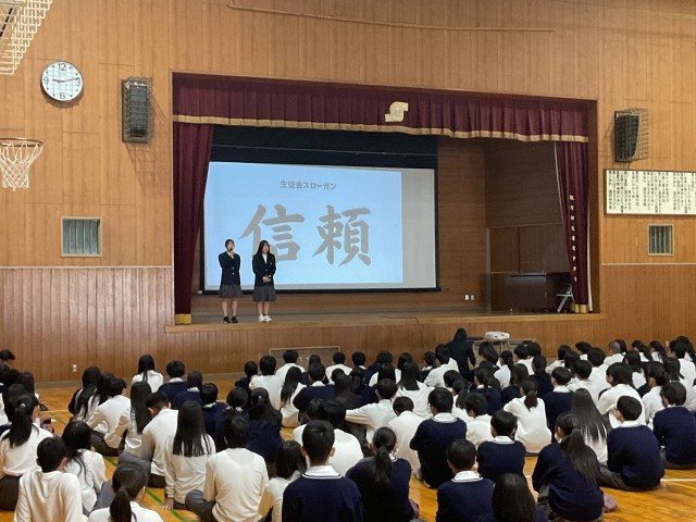 本日(4/20)、今年度最初の生徒朝礼を集合型で実施しました。校長、生徒指導主事からの話の後、生徒会長や各専門委員長等から、工夫を凝らした発表がありました。生徒朝礼終了後、引き続き、対面式を行いました。