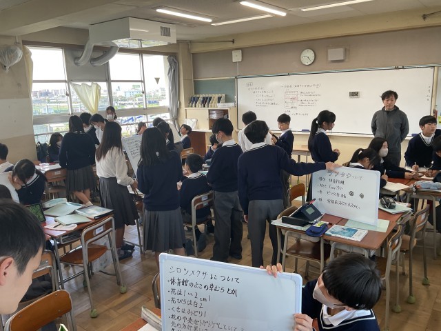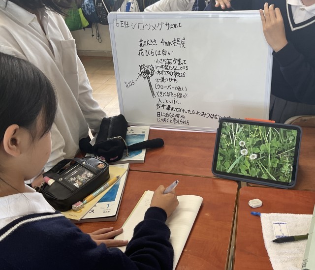 各班で、校内で見つけた生物(草花)についてまとめ、それを発表していました。他の班の発表を聞く時は、内容をメモし、質問等を行い、学びを深めていました。