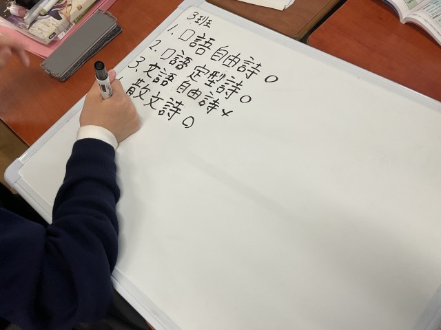 詩の形式について、班ごとにクイズ形式で学んでいました。