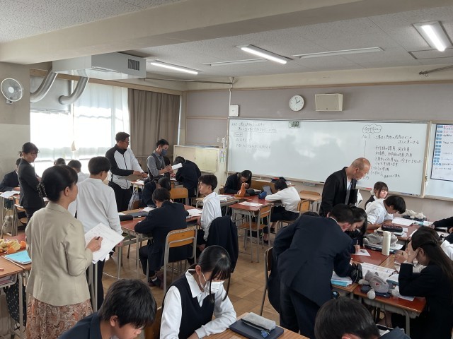 本日、2年生の各クラスで校内研究授業が行われました。どのクラスでも、生徒たちは個人でじっくり考えたり、班で意見を交換しながら学び合ったりと、非常に熱心に授業に取り組んでいました。