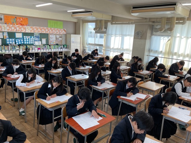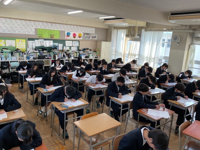 学期末テスト最終日、1年生の数学の様子です。どの最後までしっかり頑張っていました。来週から結果が返ってきますが、結果と同時に今回の学習の取り組み状況についてもしっかり振り返って、これからの学習に繋げていきましょう。