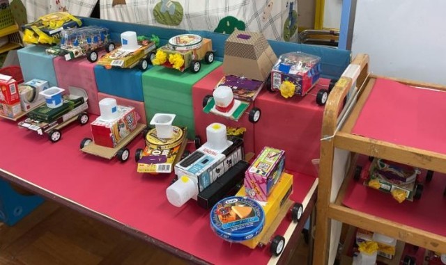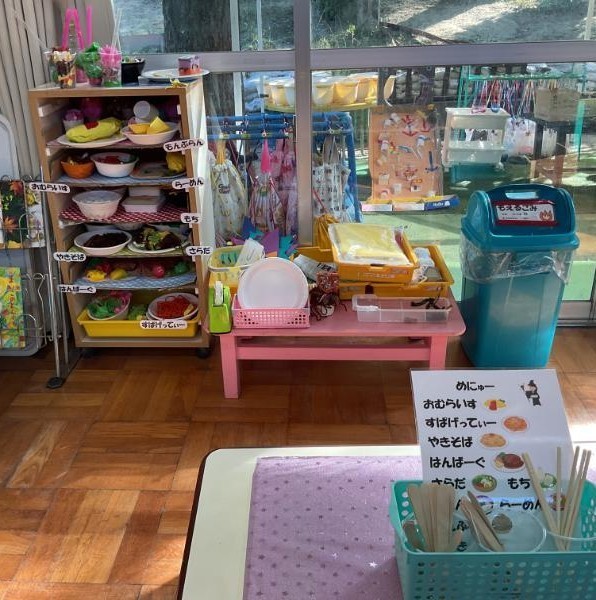 お部屋では運動会のテーマである「魔法学校」が変化した「レストラン」で、子どもたちのアイディアが実現できるような環境が準備されていました。また、クラス活動で経験した動くおもちゃ作りで新たな発想がうまれやすいよう、さまざまな身近な箱や道路に見立てたものが用意されていました。