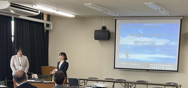 門真市の校長先生方が集まられる研修会において、枚方市教育委員会事務局学校教育部 髙山次長、そして枚方市立明倫小学校 髙嶋校長が研修講師を務めました!