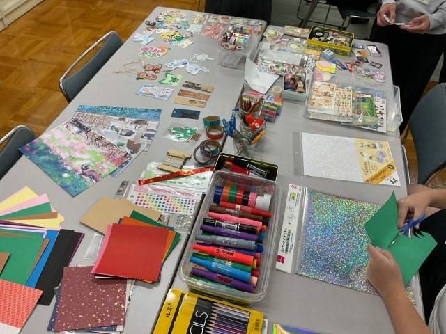 テーブルには色とりどりの画用紙、シール、紐、リボンが並び、「この色かわいい!」「ここに貼ったらもっと良くなりそう」など、ワクワクした声が飛び交います。